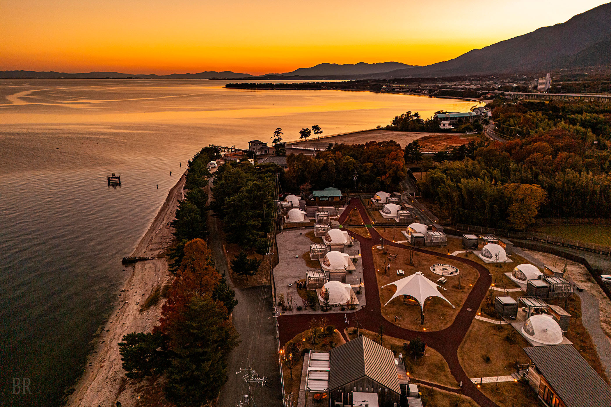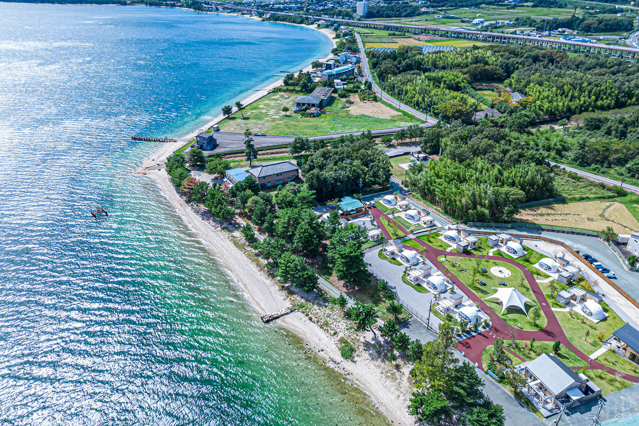 目前に広がる雄大な琵琶湖が施設の借景となります。朝日を望む砂浜で朝食を摂ったり、春から初秋にかけての鮎釣りや夏場の湖水浴場等、水質と透明度の高い琵琶湖を間近で年中楽しめる施設となっています。