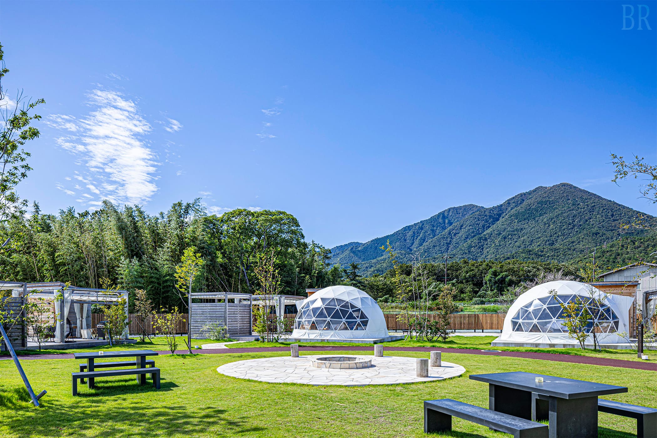 敷地中央のフリースペース、各棟には焚き火が出来るファイヤーピットを配置しております。